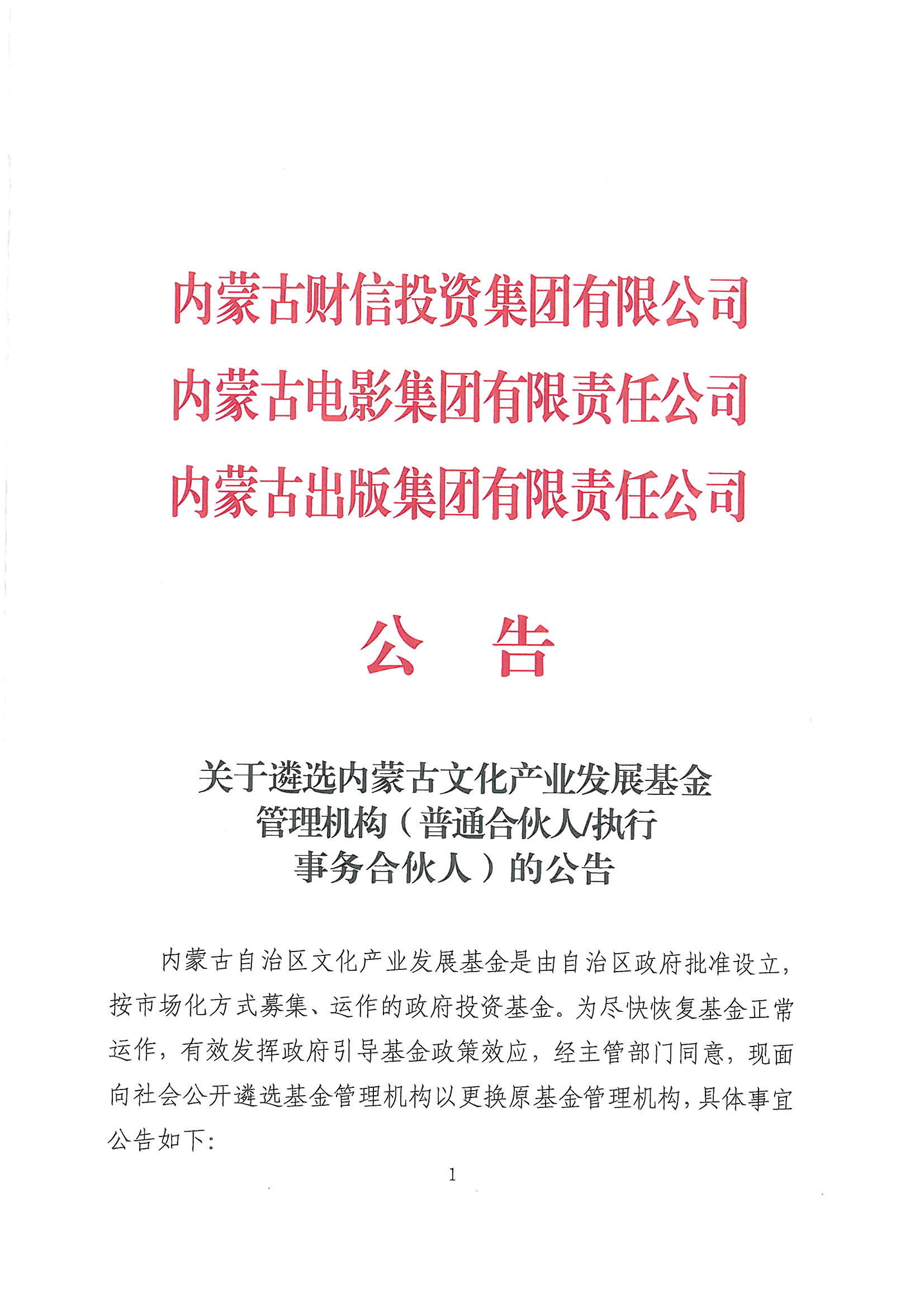 關(guān)于遴選內(nèi)蒙古文化產(chǎn)業(yè)發(fā)展基金管理機(jī)構(gòu)(普通合伙人/執(zhí)行事務(wù)合伙人)的公告