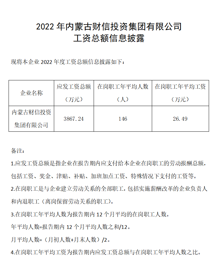 2022年內(nèi)蒙古財信投資集團(tuán)有限公司工資總額信息披露