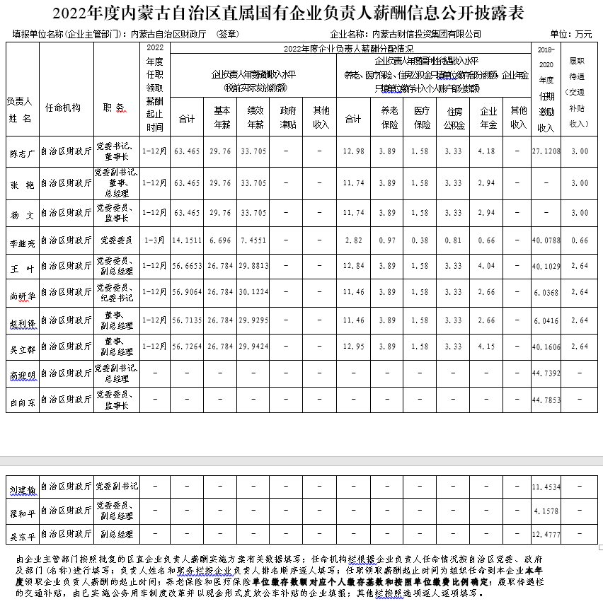 2022年度內蒙古自治區(qū)直屬國有企業(yè)負責人薪酬信息公開披露表