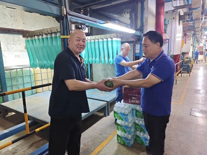 就在“職工之家”開(kāi)放之際,一份清涼也送到了職工手中。近日,華騰橡塑領(lǐng)導(dǎo)專(zhuān)程來(lái)到瑞京公司生產(chǎn)一線,向在酷暑中仍然奮戰(zhàn)在一線的干部職工送上清涼飲品和爽口西瓜,并對(duì)大家表示慰問(wèn),叮囑大家要做好防暑降溫工作。