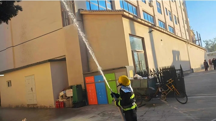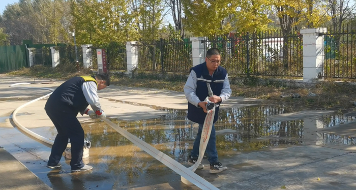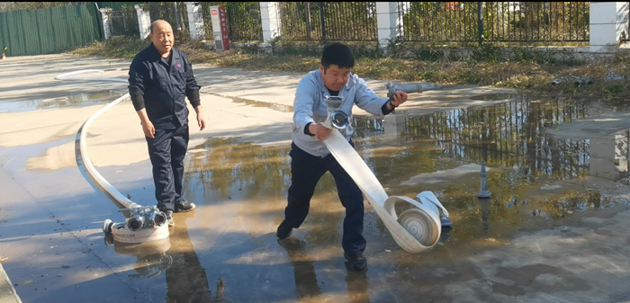 同時(shí),華騰化工還專(zhuān)門(mén)組織了消火栓實(shí)操。“先接水帶、再開(kāi)閥門(mén)、最后對(duì)準(zhǔn)目標(biāo)出水!”在安全員的指導(dǎo)下,員工兩人一組協(xié)作,快速完成水帶連接、水槍連接等步驟,水柱精準(zhǔn)噴射至指定區(qū)域,整個(gè)過(guò)程有條不紊。