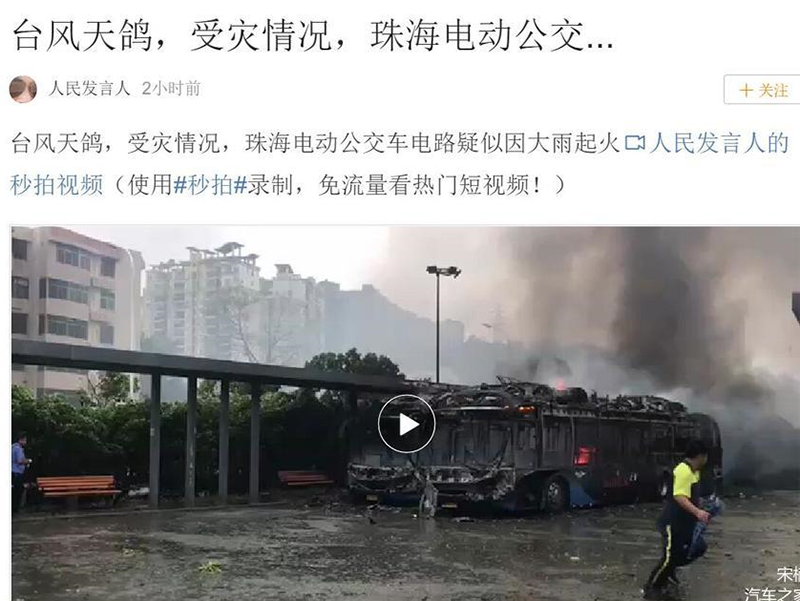 2017年8月23日,微博用戶@人民發(fā)言 人上傳了一條視頻,其內(nèi)容為: “臺風(fēng)天鴿,受災(zāi)情況,珠海電動公交車電路疑似因大雨起火”。