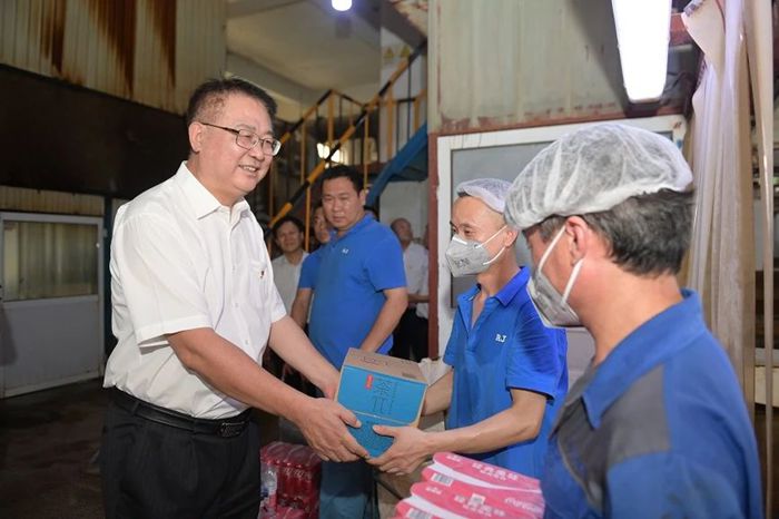 7月9日下午,北京化工集團黨委書記、董事長陳宇,黨委副書記吳瑞峰,黨委常委、副總經(jīng)理韓寶海,黨委常委、紀委書記常延輝來到華騰橡塑,進車間、到班組,親手將一份份清涼飲品送到一線職工手中。慰問過程中,陳宇詳細了解一線職工工作生活情況,對大家冒著高溫酷暑,以高度的責(zé)任感和飽滿的工作熱情堅守一線給予充分肯定。陳宇叮囑大家既要高質(zhì)量完成好本職工作,又要時刻關(guān)注身心健康,集團各級黨組織和工會組織要從各方面確保防暑降溫工作落到實處,保證干部職工健康安全。